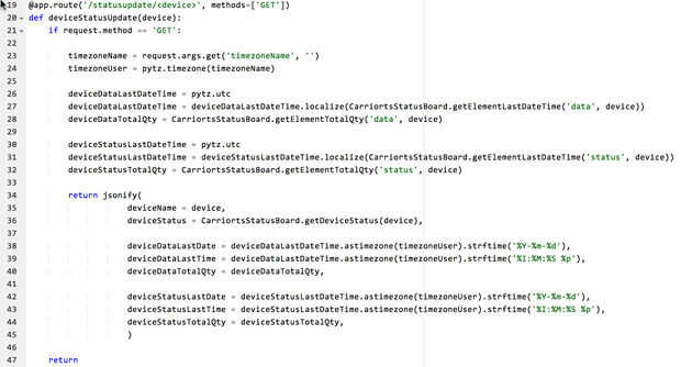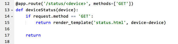 Este código define dos diferentes "rutas" o URLs que podrían ser utilizadas. La primera es /status/ < dispositivo > y el segundo es /statusupdate/ < dispositivo >. / status se utiliza para servir todo el procesa página web - el archivo HTML. ¿Notar cómo el retorno al final de la función render_template ('status.html ', dispositivo = dispositivo)? Esto es donde se integra nuestra plantilla status.html, que creamos anteriormente, en la aplicación.