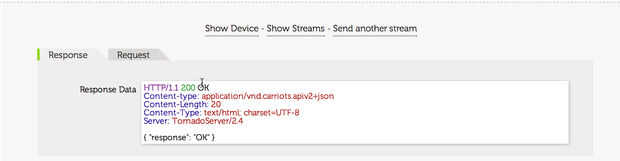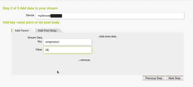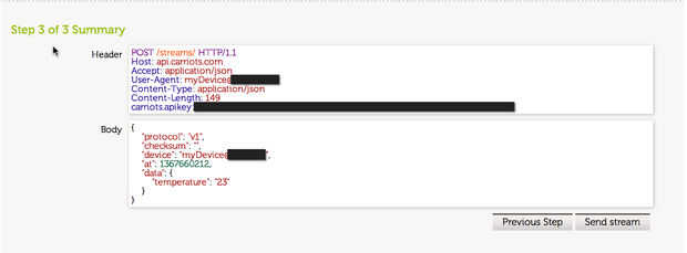 -Si nunca han registrado un flujo de datos o el estado a este dispositivo, no habrá ninguna información importante para mostrar en el widget. Vamos a publicar un flujo de datos rápido. Dirígete a tu Panel de Control Carriots. En "Gestión de datos" Seleccione «Asistente para enviar corrientes». Trabajo a través del asistente. Primero seleccione su dispositivo. A continuación, cree una clave denominada "temperatura", aunque podría ser cualquier cosa. Para el valor de uso "23" o cualquier valor. Haga clic en "Siguiente paso". Finalmente Haz clic en "Enviar Stream".