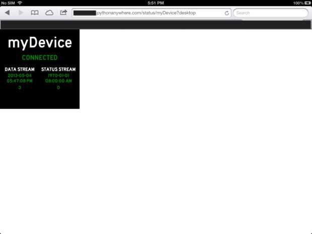 Una vez que ha desaparecido la spinner, probar la aplicación web en su navegador. Usted debe ser capaz de ir a http://username.pythonanywhere.com/status/myDevice?desktop y ver el widget en funcionamiento. Recuerda, cambiar nombre de usuario en la URL con tu nombre de usuario de la pata y si utilizó un nombre de dispositivo diferente, reemplace myDevice con su nombre de dispositivo real. Tenga cuidado, el nombre del dispositivo es sensible a mayúsculas.