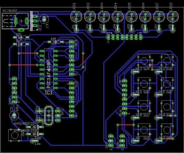 aquí es un diseño de PCB para una Junta de desarrollo de los huesos desnudo PIC16F877. Todo lo que necesitas es un cristal de 4mhz, dos tapas de 22pf, resistencia de una 4.7 k y 8 resistencias de 470 ohm, un regulador 7805 (no necesariamente es neces