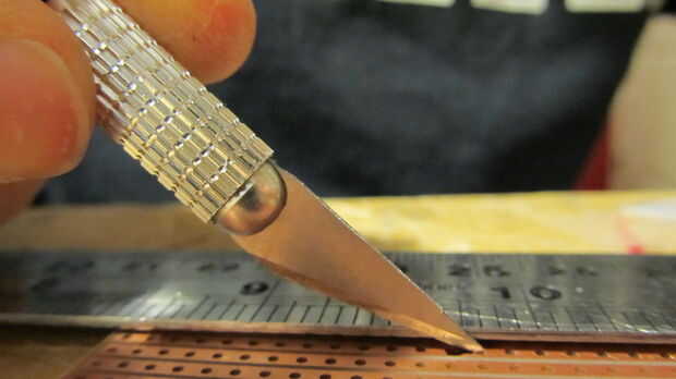 -Utilice una regla y marcar la tabla con un cortador de cuchillo o caja de exacto. Coloque el tablero sobre el borde de un escritorio.