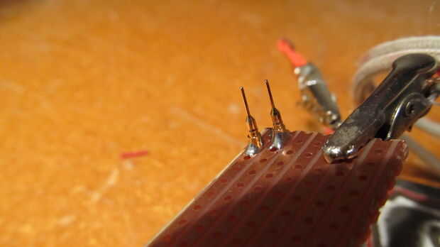 -Se dobla uno de sus componentes lleva a la forma que se muestra y soldadura que de lo positivo del alambre a la fila positiva (para mí, ésta era la fila más alejada a la izquierda). Lo bueno de la Junta de tira es que mientras se sueldan dos cosas en la misma fila, se conectará.