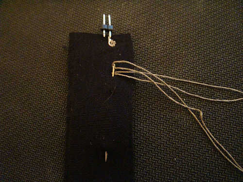 Usando el hilo conductor y la aguja, coser el lazo de alambre a la tela a partir de la parte superior del bucle y trabajar su camino hacia la izquierda alrededor. Al llegar a la parte inferior del bucle, continuar líder del lazo que se crea una traza de costura. Continuar cosiendo y dejando un rastro determinado por la aplicación (por ejemplo sensor, rúbrica femenina, etc.).