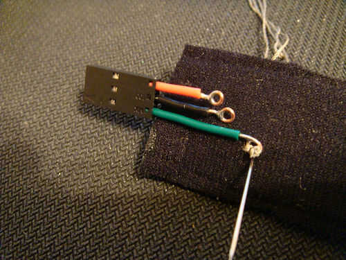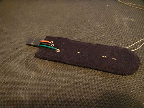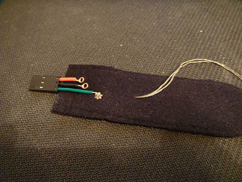 Usando el hilo conductor y la aguja, coser el lazo de alambre a la tela a partir de la parte superior del bucle y trabajar su camino hacia la izquierda alrededor. Al llegar a la parte inferior del bucle, continuar líder del lazo que se crea una traza de costura. Continuar cosiendo y dejar un rastro determinado por la aplicación (por ejemplo sensor, rúbrica femenina, etc.)