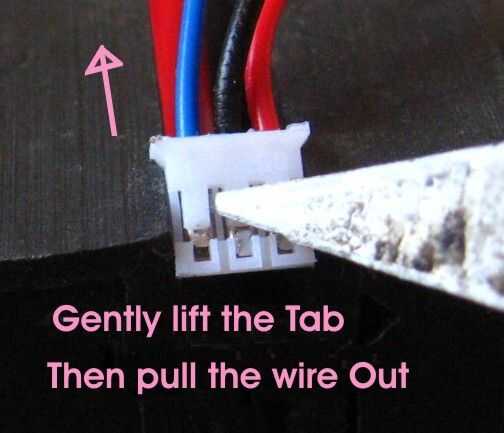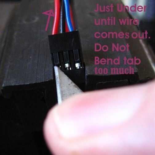 Solía tener una herramienta de conector. Parece un pequeño destornillador excepto que es un tubo hueco y la mitad delantera está abierta. Esto funciona deslizándose entre el alambre y los bloques de conector las lengüetas de fijación por lo que puede salir del conector. Jameco.com tiene cosas como esta. Cualquier cosa fina como un alfiler puede bloquear las lengüetas de fijación demasiado. No tarda demasiado para jugar con que sus ideas confluyen y conectores.
