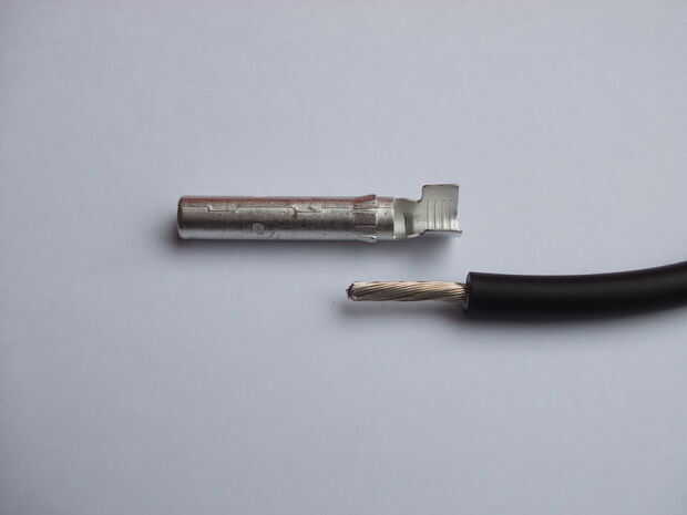 Usted notará que el cable se pela más corto que el conector de metal prensado. Hay una marca en el metal para indicar hasta qué punto el otro conector entrará en ésta, si el cable se extiende más allá de esta marca en el conector no serán capaces de unir los conectores MC4.