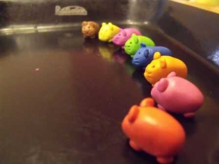Poner el GPs terminado en una bandeja y poner en un horno precalentado a 130° C (250° F, marca de Gas 1/2) por 30 minutos. Dejarlos enfriar por unos minutos después de que salen antes de tocarlas. (Las instrucciones de cocción son de Fimo, tienes que mirar en el paquete para otros tipos de arcilla)