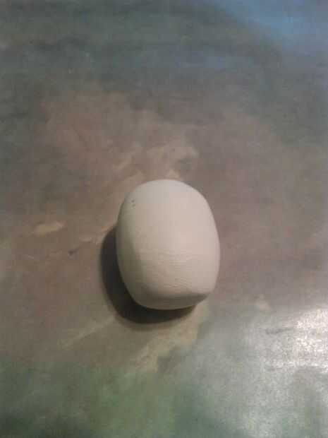 alrededor de un óvalo de buen tamaño de la arcilla blanca. elige un lado donde la cara de conejos. Presione su dedo pulgar cerca de la parte superior del óvalo. piso en la parte inferior del óvalo.