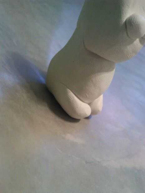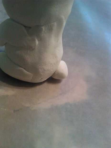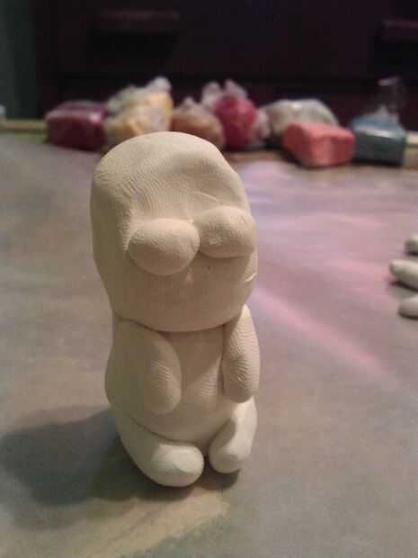 rollo cuatro pequeños cilindros para las piernas del conejo. Acople al cuerpo y se mezclan el cuerpo y las piernas.  alrededor de una pequeña bola de arcilla blanca que se utilizará para la cola de los conejos.