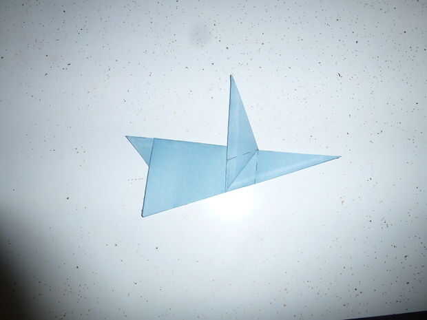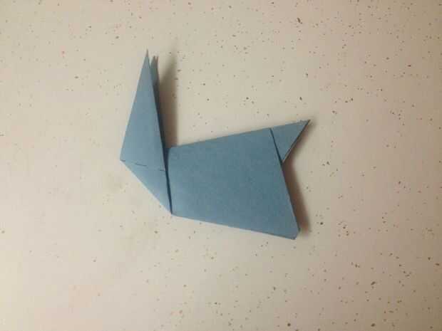 Gire el papel para que el doblez del centro está lejos de usted y el otro borde es plano hacia usted (foto, arriba). Doblar por la mitad superior de la cabeza en un ángulo de 60 grados (foto de arriba, abajo a la izquierda), usando el corte como el punto de anclaje para la parte superior de este redil. Dé vuelta el papel y hacer lo mismo en el otro lado. Son orejas de tu conejo. Usted ahora ha completado el conejito de origami básico!