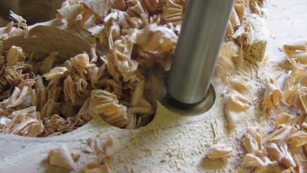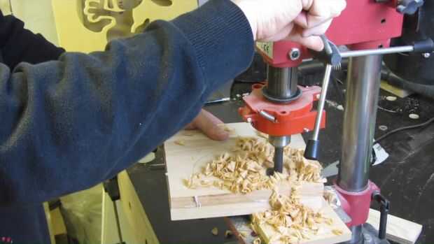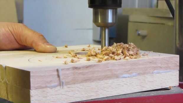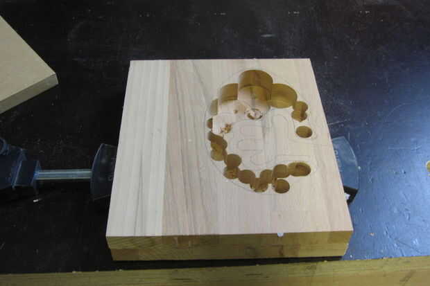 Usé la plantilla para dibujar el contorno de ambas piezas por separado y utilizar pedacitos de Forstner de diferentes tamaños para eliminar la mayoría de la madera. Esto produjo un lote de chips.