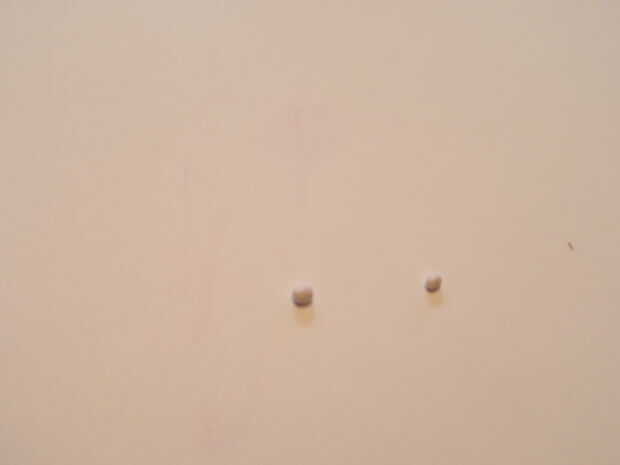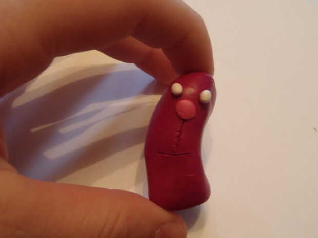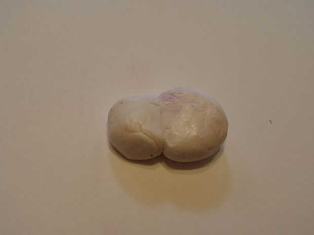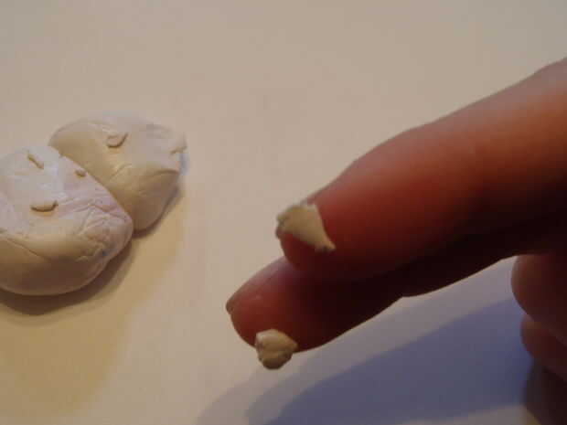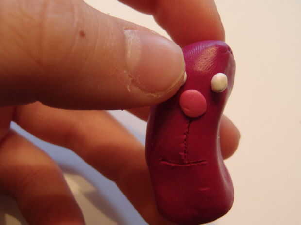 Coge la arcilla blanca y toma dos bits del bloque de igual tamaño. Hacerlas rodar en bolas sobre la mesa y coloque al par en la cabeza, sobre la nariz. Presione hacia abajo sobre los ojos y aplane contra el cuerpo.