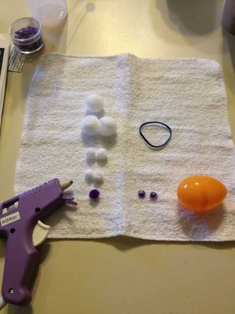 Lo que usted necesita: una nueva toallita cuadrada (no tiene que ser blanco), 7 blancos pompones (2 mini, 2 pequeñas, 3 medianas), una mini pompones de cualquier color que desea utilizar como la nariz, un par de ojos saltones, un huevo de Pascua plástico, una banda de goma y pegamento caliente. También es necesario "bigotes". Nos fuimos de la tienda de artesanía en la sección de flores. Estos son lo que usan para el centro de las flores. Nos empataron a 2 de ellos para formar una cruz como forma