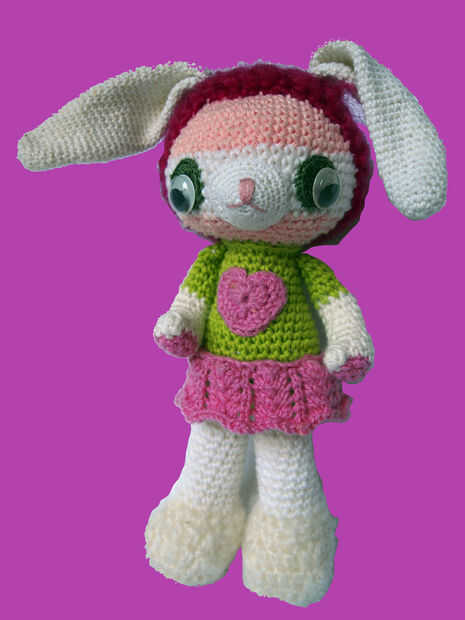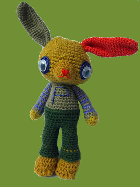 Comience con la cabeza, la parte superior de la cabeza y básicamente del ganchillo en círculos, aumentando y disminuyendo para hacer la forma. La cabeza, cuerpo y patas están hechas de una sola pieza. Los ojos, orejas y nariz se hacen como piezas decorativas sueltas que coser en. La parte inferior de los pies son como las tapas que puntada a cerca de, y los brazos se crochetted por separado y cosidas en. Amigurumi es crochetted bien y necesita rellenar el amigurumi como vas, particularmente la cabeza necesita ser bien rellenas.