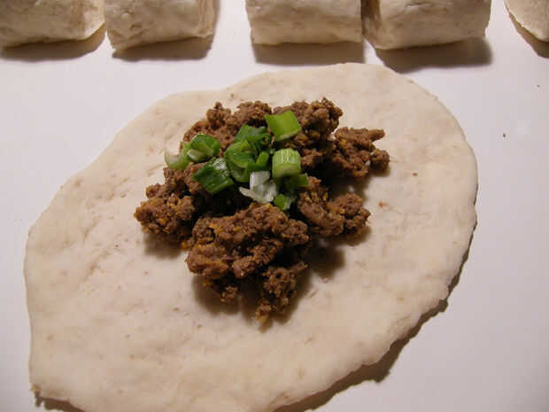 Plano cada parte ya sea usando la mano o palote, colocar 1 cucharada sopera colmada de carne de taco, 1 cucharadita en rodajas cebolla, pizca de costura a sellar.