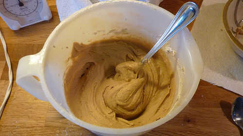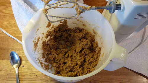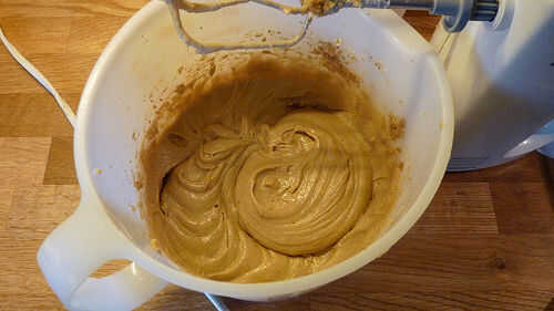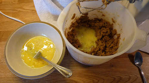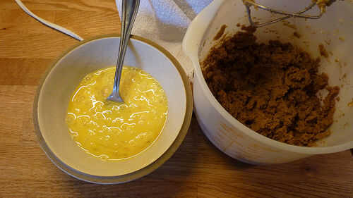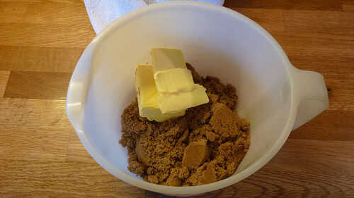 Añadir el muscavado azúcar y la mantequilla en un tazón y usando una batidora eléctrica, mezclar hasta que quede suave. Batir los huevos y poco a poco agrega a la azúcar y la mantequilla, mezcla otra vez hasta que quede suave.