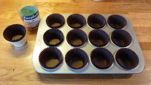 Para empezar los cupcakes, línea una lata del mollete con 12 casos de grande de la Magdalena, opté por brown para seguir con el tema del suelo y poner la bandeja a un lado. Configurar tu horno a 180C por lo que puede precalentar mientras haces tu cupcake de la mezcla,