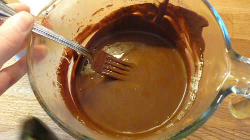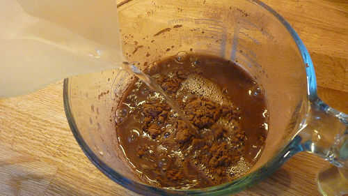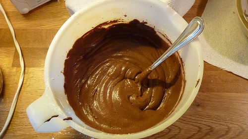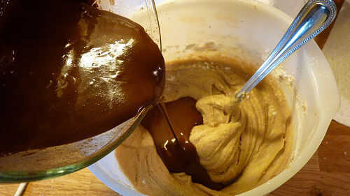 Agregar ahora refrigerado por mezcla de cacao y mezclar. Asegúrese de que usted rasque alrededor de los bordes, por lo que no hay claro mezcla izquierda.