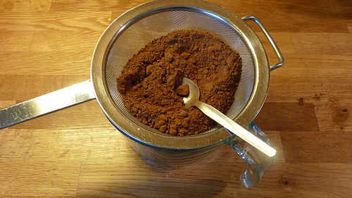 Tamizar el cacao en polvo en un recipiente resistente al calor o jarra y añadir el agua hirviendo. Bata hasta que totalmente liso y luego dejar a un lado que se enfríe.