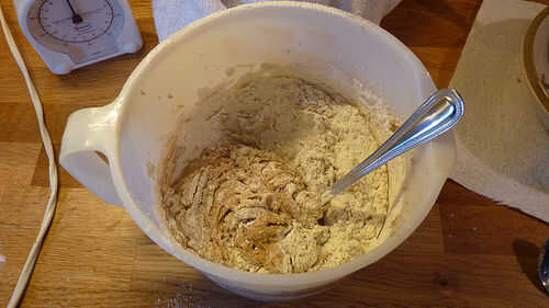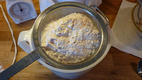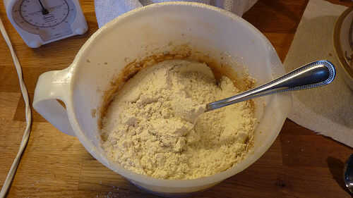 Tamizar la harina en el recipiente y luego usando una cuchara de metal revuelva la mezcla. No te olvides de añadir la levadura, el libro realmente se olvida de mencionarlo, y no recuerdo hasta que fui repartir la mezcla.