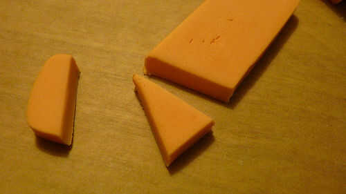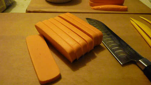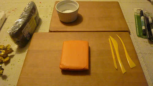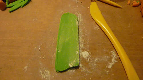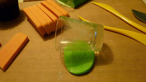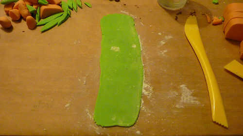 Una pequeña parte de la Junta el polvo con azúcar glas. un poco pequeña de fondant verde y ruede hacia fuera aproximadamente de 1 mm de espesor. (No tienen un pequeño bastante palote, usé un vaso de chupito espolvoreada en azúcar glas). Cortar triángulos de aproximadamente 1 cm largo fuera de esto, estos serán tu verdor sobre las zanahorias.