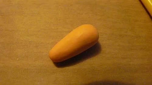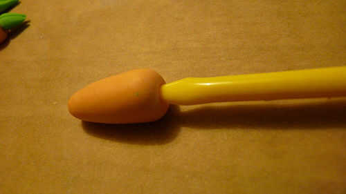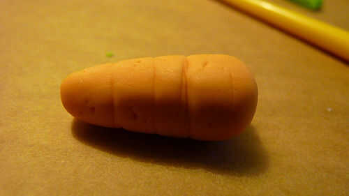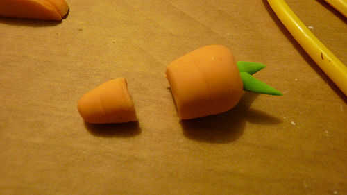 Con las rodajas de naranja (fondant), corte en partes iguales (cortar em triángulos otra vez y tiene cerca de 4 a 5 de cada rebanada). Rollo de estas piezas en forma de bola, ellos alargado en forma de zanahoria. Si encuentra que su fondant es agrietarse, rodar hacia fuera usando el perno de balanceo o de vidrio y retroceder en una bola, esto debe ablandarlo un poco y detener grietas formando. Añadir un agujero en la parte superior de la vegetación y poner líneas de indentación como una zanahoria real alrededor del exterior. Apriete juntos los dos extremos de los trozos de vegetación e inserte en el orificio de la zanahoria. Si te gusta se puede mezclar una pequeña cantidad de glaseado real y utilizarlo como un pegamento aquí.