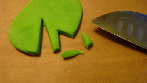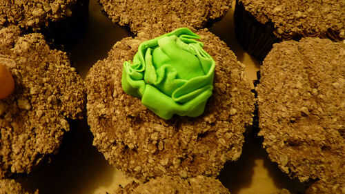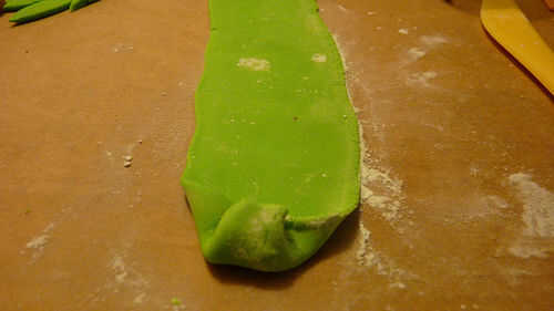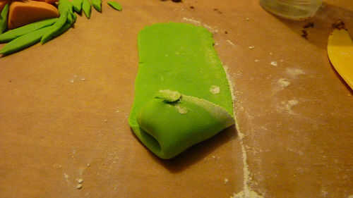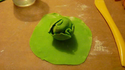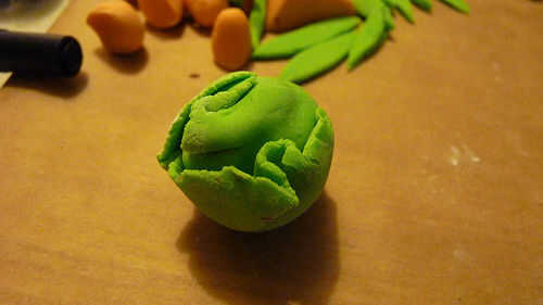 Para las coles, mina como las coles de cera falsos que hacen en Japón para las exhibiciones de alimentos. Inicio reanudando una rebanada gruesa de 2 mm de fondant, para desempolvar la superficie de trabajo y el rodillo de cristal y rodando hacia fuera a cerca de 1 mm de espesor. En la parte inferior del inicio tira manojo hacia arriba y mover hacia arriba la franja, oscilando hacia adelante y hacia atrás recogiendo el fondant alrededor de sí mismo. Luego, tomar otra rebanada delgada y rodar hacia fuera en un círculo irregular, agregar un poco de agua o hielo al centro del círculo para que sea pegajoso y querer pegar. Coloque la primera parte de la col en el centro del círculo y recoger el círculo alrededor de él, no te preocupes si lo arrugas y pliegues, se suma al efecto. Probablemente tendrás que cavar un agujero en el suelo para plantar su col, de lo contrario voy rodando en usted!