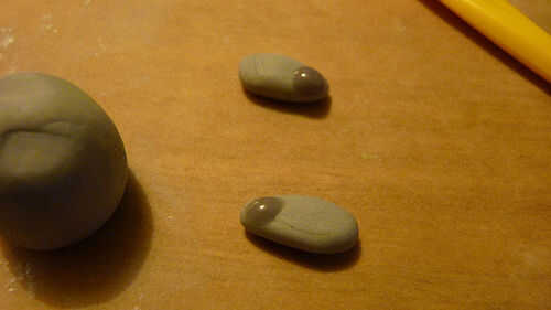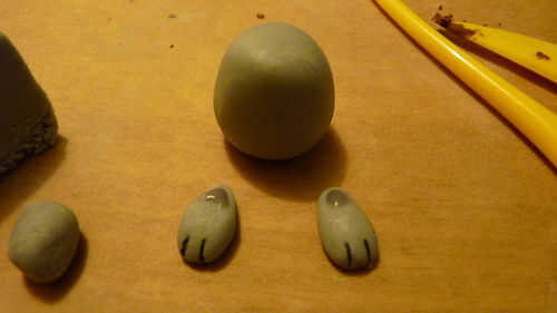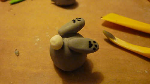 Para hacer el conejo saltando en un agujero, comenzar con la parte inferior de la mitad de una forma de huevo, sólo podía hacer una forma de huevo y cortar la parte superior. Hacer 2 salchichas pequeñas, aplana la ligeramente y forma cónica y el final. Utilice algunas Glas mezclado con colorante alimentario negro para hacer gris pegamento para pegar las salchichas al huevo, para que un cuerpo con patadas pies. Tomar una pequeña bola al fondant, pinchazo y prod para que se vea esponjosa y textura y pegarlo a su base de la misma manera. Luego puede agregar detalles como las almohadillas de la pata usando un lápiz de hielo.