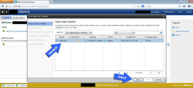 • "Añadir vApp de catálogo: seleccione vApp plantilla" seleccione explotación *** y haga clic en siguiente (*** es el número del curso)