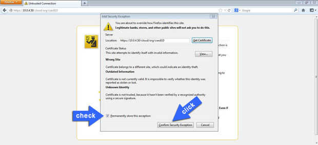 • "Añadir excepción de seguridad" permanentemente almacenar esta excepción marcada y haga clic en confirmar excepción de seguridad.