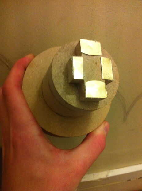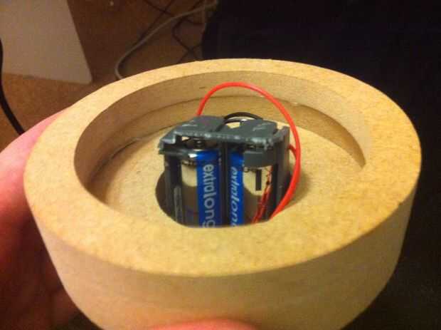 Las dimensiones de la ranura clave internamente, deja espacio suficiente para usar la caja de las pilas de la radio original de Sony. Recorte de la radio y tallar hasta tamaño suficiente para mantener las baterías en su lugar y deslice en la carcasa cilíndrica. De soldar dos cables de salida de cada batería y cable los cables correspondientes a los lados opuestos de la 'plus' en la base. Para mi metal conductivo usé pastillas pre soldado comprados Maplins (han subido el enlace de más abajo). Usando cortadores de alambre, corta con el tamaño de los más extremos y pega abajo firmemente hacia el exterior de la base de la llave.