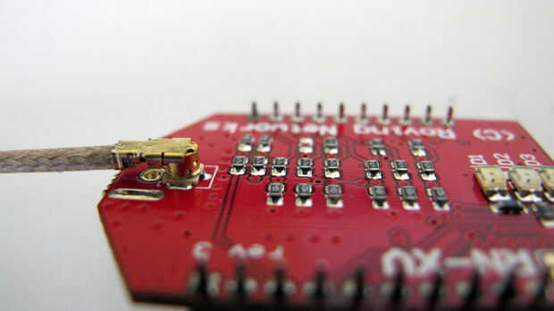 Delicadamente pero con firmeza, broche de presión en el conector u.fl hembra en el extremo de u.fl - SMA cable adaptador al conector u.fl hombre, soldado en su PCB para montaje en superficie.