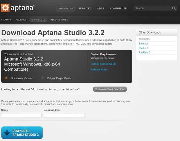 Obtener su libre Aptana Studios 3 software aquí! No hay condiciones, es software libre, top of the line. Si utilizas mac, haga clic en el boton que dice personalizar la descarga.
