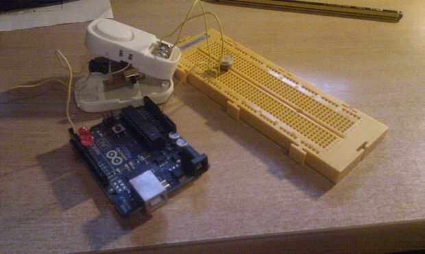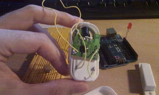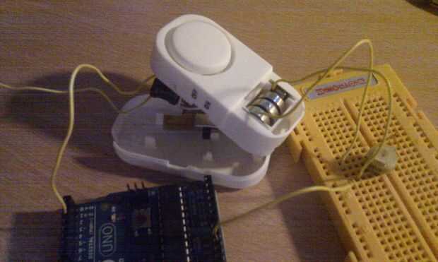 Por otra parte hemos de soldar un cable (de color amarillo en el diagrama) al extremo del interruptor de lengueta que no va unido al negativo de las baterías y llevarlo hasta el pin 2 de Arduino.