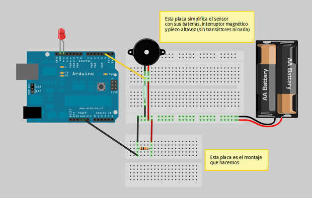 En el diagrama hay Junta de dos placas, la superior formulan de forma minimalista el sensor, con las baterías, el piezo altavoz y el interruptor de lengueta. La inferior represen nuestra placa de trabajo (la amarilla en el resto de fotos).