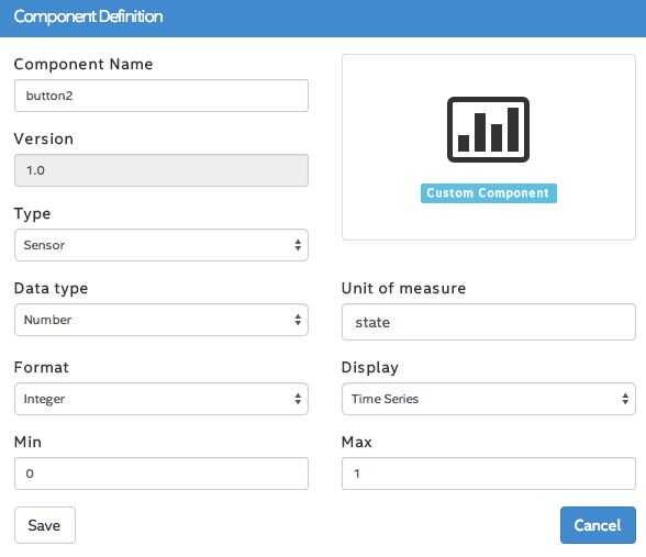 Una vez que el dispositivo añadido a su cuenta, usted necesitará definir en la consola lo que vas a utilizar con su Edison los sensores. Esto se hace bajo la cuenta > pestaña catálogo en tablero de instrumentos. Hay unas cuantas ahi por defecto, pero por supuesto voy agregando más. Agregare agregando otro componente pulsador denominado "button2". Haga clic en "Agregar componente" en la página de catálogo y rellenar en la página que aparece (ver mi segunda foto). Es bastante sencillo, pero aquí hay algunas cosas que he encontrado hasta ahora: