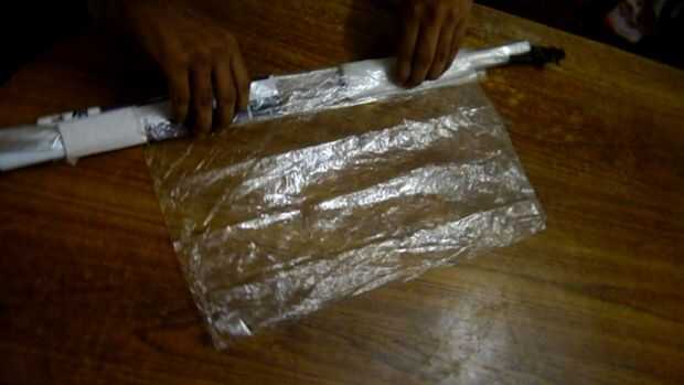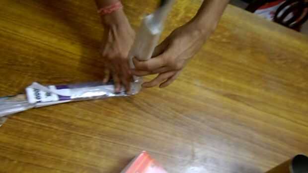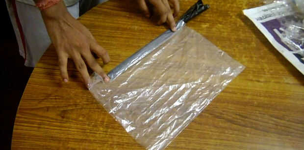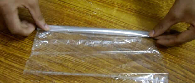 Ahora toma 2 bolsas grandes de plástico... Incluso 2 bolsas de plástico de mediano o pequeños serán suficiente. Tomar la mitad de las pequeñas bolsas de plástico y colóquelo en una bolsa de plástico grande y luego rodar a lo largo de la bolsa de plástico grande. Si aquí se utiliza plástico grande, tenemos que la formación obtenida en la mitad de la curva, pero si se utiliza la pequeña bolsa de plástico, no es necesario.