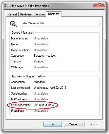 4. Encontrar la dirección MAC o identificador único de su auricular. Esto es un valor hexadecimal de 12 dígitos. En windows, abrir "Dispositivos e impresoras" clic derecho en MindWave Mobile, seleccione "propiedades" y desplazarse a la ficha "Bluetooth" escribe el valor de 12 dígitos para el auricular. Guardar para más tarde.
