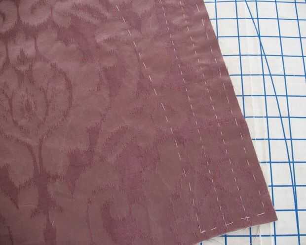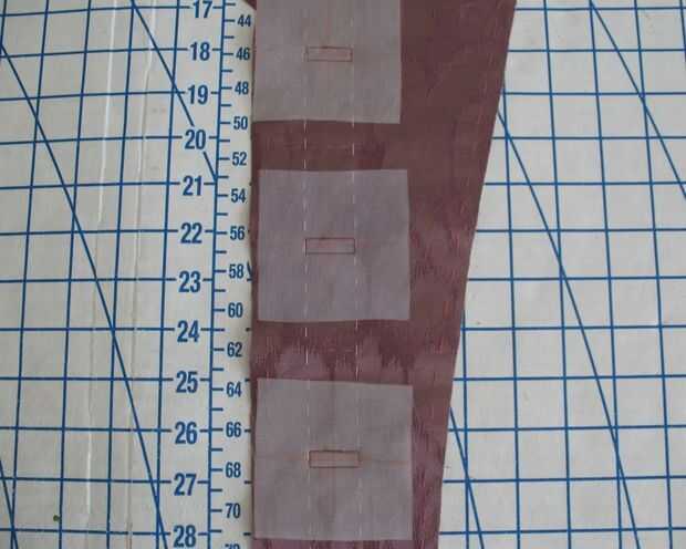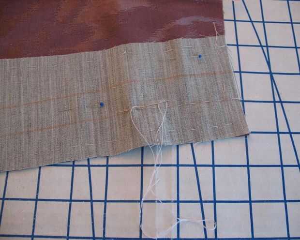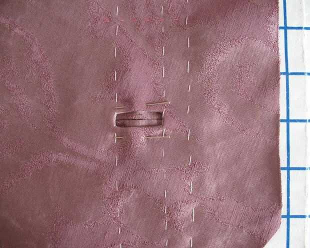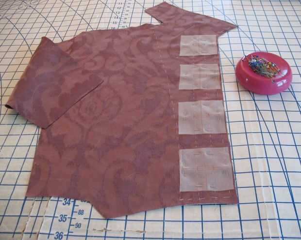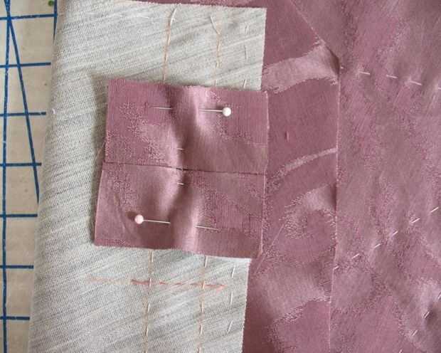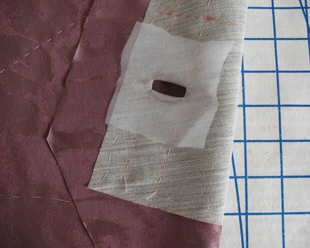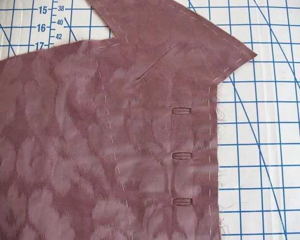 Lona de pelo fue hilvanada a cada delantero como una entretela. A continuación, colocación de ojal marcó con tiza en el lado equivocado y la mano hilvanadas para que vean en el lado derecho (donde se aplican los ojales límite).