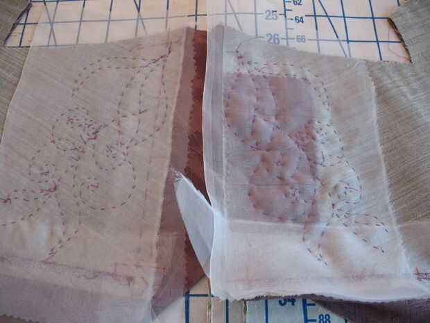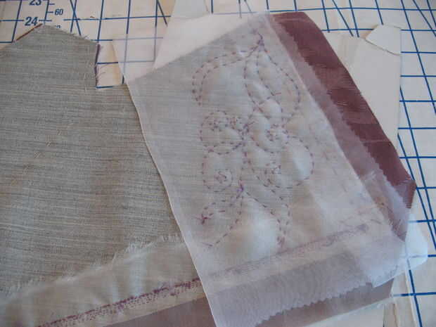 Después de fijar el diseño en su lugar, mano hilvanadas a través de todas las capas (organza, tela de pelo y tejido) que me permitieron ver el diseño del lado derecho sin tener que preocuparse eso tiza o lápiz marcas no podrían desaparecer permanentemente después de que terminó el rebordear.