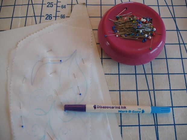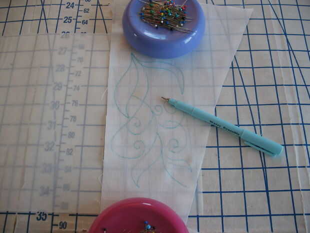 Las curvas son un poco de molestia a transferir a la tela tejida ya que la pluma está arrastrando a través del diagonal. Para mantenerla estable, usé unos cuantos alfileres!