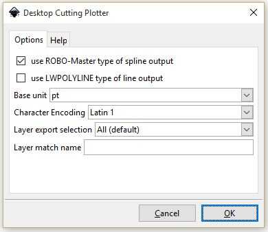 Le pedirá un cuadro de opciones sobre detalles adicionales para el archivo guardar como y tendrá que marcar "usar tipo de ROBO-Master de salida de la tira" y desmarca "usar tipo LWPOLYLINE de salida de línea" que es lo opuesto a los valores predeterminados.