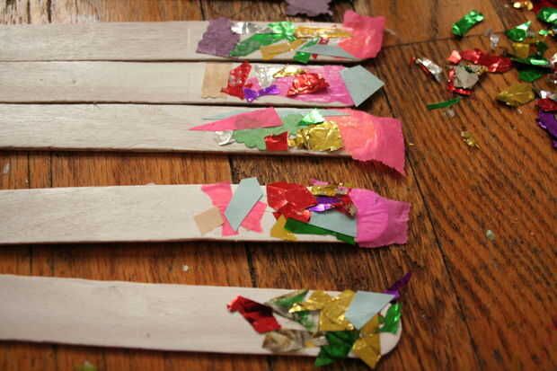Cepillo en una generosa cantidad de Mod Podge para una mitad de cada uno de los palos, y se adhieren unos pequeños pedazos de retazos coloridos de confeti, papel de seda y papel de construcción. Incluso puede hacer que algunos de la muestra blanco en algunos lugares para darle una mirada de encargo aseada. Luego, una vez que el pegamento se haya secado, corte cualquier exceso.