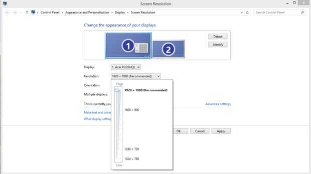 Haga clic en cada monitor y a continuación se le mostrará las diferentes configuraciones de resolución en un menú desplegable. Las instrucciones de su monitor deben haberle proporcionado la resolución recomendada. De lo contrario, Windows le mostrará una escala de resoluciones recomendadas.