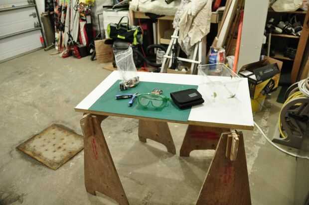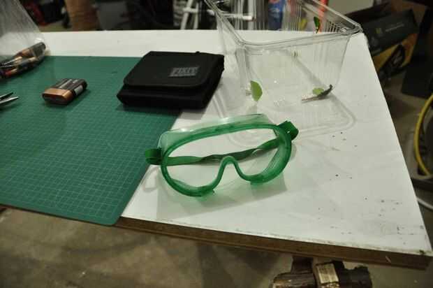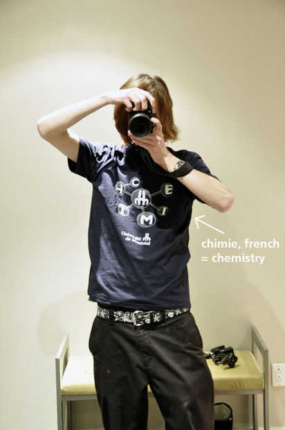 Santo fuma. Llevo una camiseta de Université de Montréal con la palabra "chimie" (química, en francés) formando una molécula y estoy a punto de desmantelar algunos AA (= un montón de productos químicos) con algunas mascaras que me hacen ven más como un verdadero científico de laboratorio. Y el propósito general es recoger carbón y explotar sus propiedades (alto punto de fusión, buen conductor) que conozco.