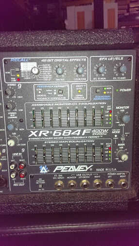 Al utilizar la mesa de mezclas en estéreo (izquierda / derecha) su volumen principal está en la parte inferior derecha (botón blanco) y tiene la banda 9 EQ para obtener el mejor sonido de la sala. Usted puede seleccionar sus efectos (reverb / delay etc.) en la parte superior y usando el botón azul en cada canal se puede ajustar para cada entrada.
