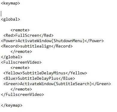 Mi keymap.xml está en la imagen. ¿Lo que hace? Cuenta con sección dos: global y FullscreenVideo. En global pongo acciones Kodi qué hará en la ventana principal y todas las ventanas. En FullscreenVideo son acciones Kodi qué hará sólo cuando es video completo en la pantalla. Creo que esas líneas son autoexplicativas. Parte de interesante es el comando ActivateWindow(). Este es un comando que se abrirá una ventana de esta lista de. Hay un montón de ventanas que usted puede abrir este comando para poder utilizar el mando a distancia de muchas maneras diferentes. Usar la fuerza :)