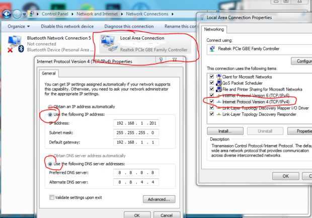 Haga clic derecho sobre la conexión que está utilizando y haga clic en "Propiedades", en la mayoría de los casos, va a ser la "conexión de área Local". Haga doble clic en "Protocolo de Internet versión 4 (TCP/IPv4). Asegurar el "usar la siguiente dirección IP" y "usar las siguientes direcciones de servidor DNS:" está seleccionada. Con la información de antes, entrar en su puerta de entrada subnet mask y default. Si esta es la primera vez que haces esto, establecer la IP a algo cerca de 192.168.1.200, pero no por debajo de 192.168.1.150. Cada dispositivo debe tener una IP diferente. El servidor DHCP entrega IP que no estén en uso. Si su PC está apagado y a una IP baja, puede prestarse a un dispositivo diferente. Esto causará problemas. Configurar la primera DNS a 8.8.8.8 y 8.8.4.4 el segundo. Estas son administradas por Google, así que no tendrás problemas. Luego marque la casilla "Validar configuración al salir" y haga clic en Aceptar. Esto comprobará errores y ayuda que arreglarlos. Probablemente no habrá ninguno. Luego haga clic en aceptar otra vez y dejar que el control ejecutaran y buscan errores. Corregir los errores o simplemente haga clic en cerrar cuando termine.