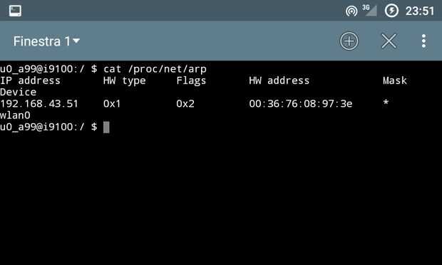 Cuando el IPC se conecta a la wifi tethering el sistema android y sistemas linux en general creo que registros de la arrendada dirección ip en un archivo en la ruta /proc/net/arp, así que publicar el comando cat en el shell de terminal en el teléfono como en la primera imagen, por arte de magia debe encontrar la dirección ip concedida.