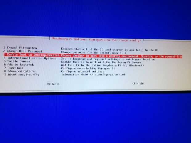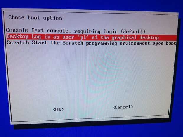Algunas de las opciones son que permiten su Pi a trabajar con la cámara oficial de RaspberryPi. También puede cambiar el nombre de usuario y contraseña del Pi. Para nuestros fines solo vamos a elegir la 3ª opción de ajuste para arrancar a la interfaz de escritorio cada vez.